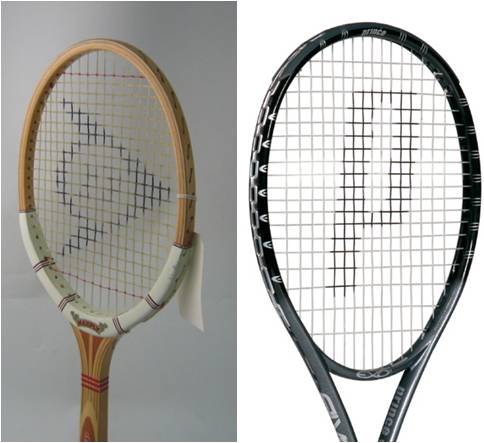 Tennis rackets have changed considerably since spaghetti strings were banned in 1978 (Figure 2). Racket manufacturers began experimenting with composite materials in the late 1970s and 1980s, mainly due to their high stiffness-to-weight ratio in comparison to wood. A modern composite racket is both lighter and stiffer than a traditional wooden racket. Composite materials have also allowed head sizes to increase by approximately 30-40%. These advances in racket technology have allowed professional players to hit their shots faster and with increased accuracy.