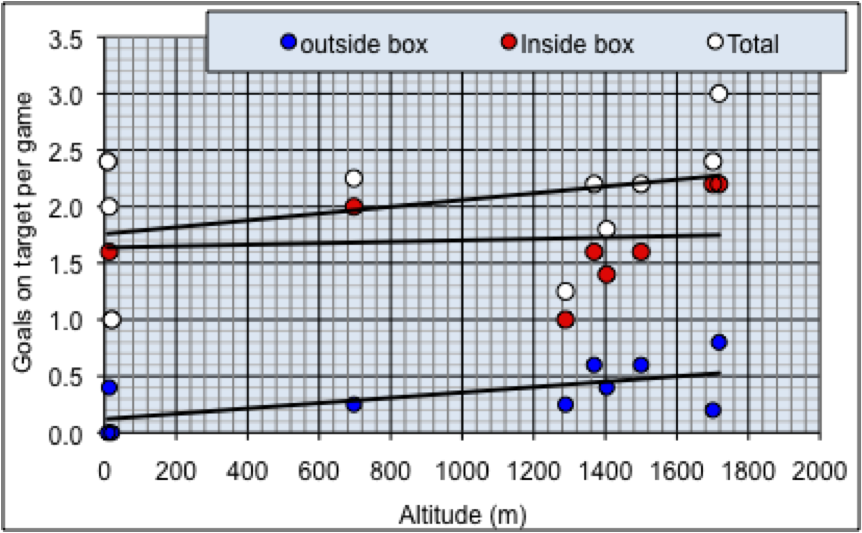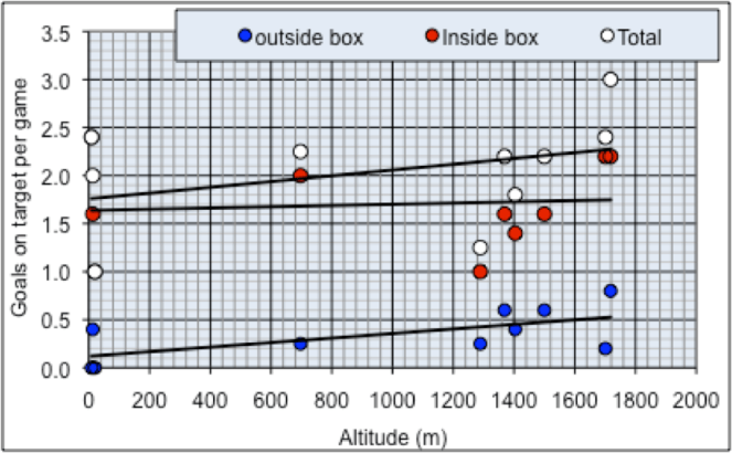 The trend line in Figure 4 implies that the number of goals per game increases from around 1.75 per game at sea level to around 2.25 at 1,700 m. The number of goals from inside the area is, on average, around 1.75 per game at all altitudes so the increase appears to be largely due to goals from outside the box.