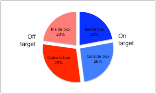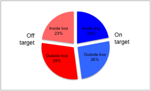 Well, let’s first consider the total number of shots; in the group stages there were (surprisingly) a total of 1302 shots of which 624 were on target and 678 were off target. There were also more shots in general from outside the box from inside (718 compared to 584). While the number of on- or off-target shots inside the box were the same, there were slightly more shots off target from outside the box. This is as might be expected with longer shots being less likely to hit the goal.
