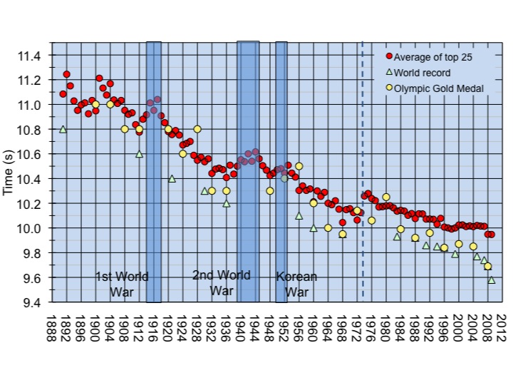 A closer look at the numbers reveals some surprising effects.  Figure 1 shows the progression in the 100 m sprint since the 1890s using world records, the Olympic Gold medal and the top 25 performances by individual athletes in each year (i.e. the best performance by the top 25 athletes).  What does it reveal?