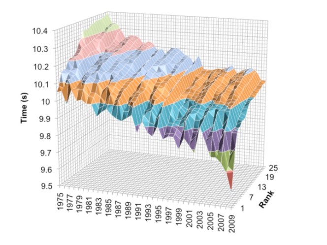 So what is Usain Bolt’s effect? The top 25 average performance in Fig. 2 shows a visible dip in 2008 and 2009 – but how much is just Bolt and how much is it his peers?  (It’s important to point out that Usain Bolt, and indeed any runner is only included once in this statistic) Fig. 3 shows the top 25 performances since electronic timing was introduced in 1975.  The whole plane of performances moves down over time indicating that all performances are getting better; the red spike in 2009 is Usain Bolt and shows how good he is compared to the other 850 top 25 performances over the last 35 years.  It seems that the ability of Bolt, and others before him, produces such intense competition that his peers improve too.
