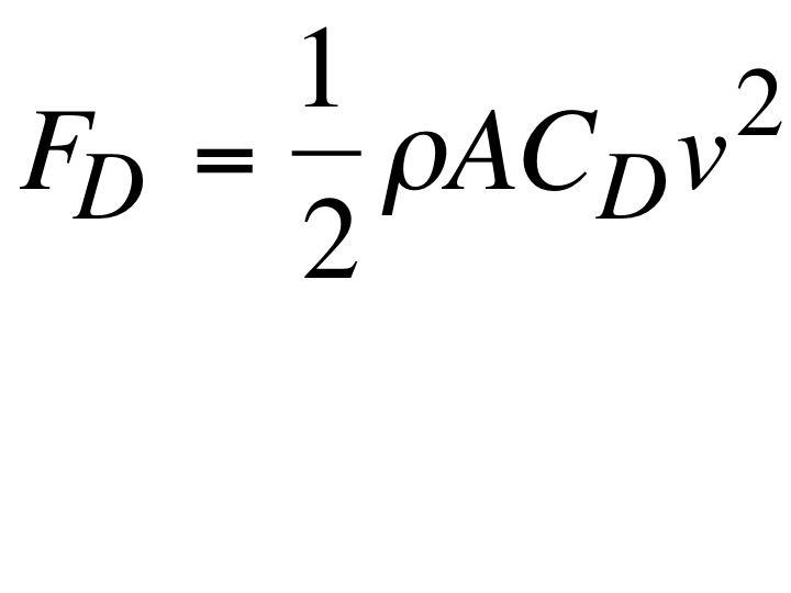 The formula for drag force (left) tells you that force (F) is proportional to the density of the air (rho), the presented area of the runner (A), the drag coefficient of the runner (Cd) and the speed (v) squared. So, all things being equal, if you double your speed the drag force quadruples.