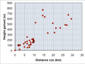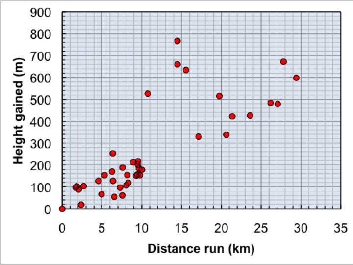 Posts on Runners World pointed me towards this article in Running Times Magazine. Work on treadmills found that every 1 % of incline increased times by around 3.3%. In comparison, my prediction equates to around a 10% increase for every 1% of incline or three times as large. I think the basic difference is the terrain – rarely does treadmill running involved jumping over boulders or logs.