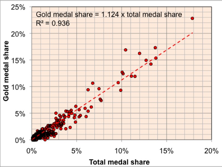 Figure 3. The relationship between gold medal share and total medal share for the 6 Olympic Games between 1988 and 2008.