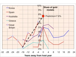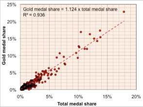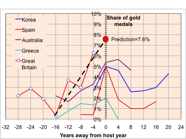 Analysis of what has gone before – especially with Australia – says that we are likely to get 60 medals with 21 of them being gold, putting us 4th in the table. Now I’m going to ruin all that good work and go with my gut instinct and say that our gold medal share appears to be rising faster than the average – in Beijing we already had over 6% of them and a simple linear fit (Figure 5) predicts that we ought to get around 7.6% of the share of the golds (equivalent to 23). Perhaps I am also being pulled by the peer pressure of Shibli and Gratton who predict 27 Gold medals. My modified prediction, therefore, is this: