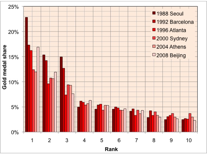 Figure 4. The relationship between rank and the share of gold medals for the last 6 Olympic Games between 1988 and 2008.