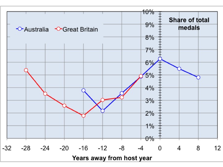 Figure 2. Share of all medals for Australia and GB with respect to their host year (the host year is set at zero).