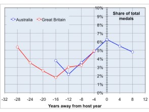 According to Shibli and Gratton (and others), it appears that the number of medals a host-country gets before they host the Olympics increases quite dramatically and during their host year, there is an additional home effect. The bid to host the Games is made 7 years before the event (in our case in Singapore in 2005) – by this point we had already had two decent Olympics under our belts (2000 and 2004) coming 10th in both cases. By Beijing in 2008 preparations for our own Olympics were well under way. It was our best placing since 1924, with 47 medals and 4th place.