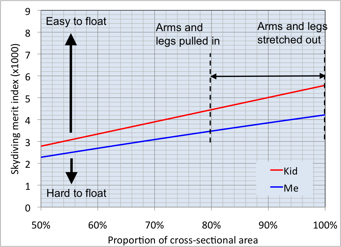 The subtleties of flight are controlled by stretching your arms out and pulling them in: a bigger cross-sectional area makes you go up while a smaller one makes you drop. The graph below shows that the merit index drops when you pull your arms in so you float less easily. What is interesting about the difference between the kid and me, is that my merit index has both a lower value and also a lower gradient – this means that I am less susceptible to minute changes in my body posture and surface area. For the kid, however, not only is he likely shoot up into the wind tunnel if the wind speed is too high, but he is also less stable.