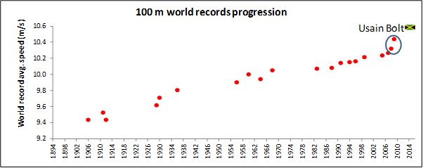 In the first graph below we can compare Usain’s current world record in 100 m to previous records. We’ll stick to using average speed (m/s) as our performance measure because it is the standard unit of measurement.