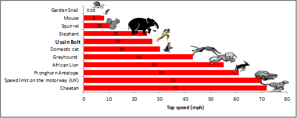 Sadly, Usain is only mediocre when his top running speed is compared to the animal kingdom, even beaten to his top speed by a domestic cat, albeit a fast one! This graph shows how remarkably fast some land animals run, the fastest of them all being the Cheetah clocked at 72 mph, even faster than the speed limit on our motorways!