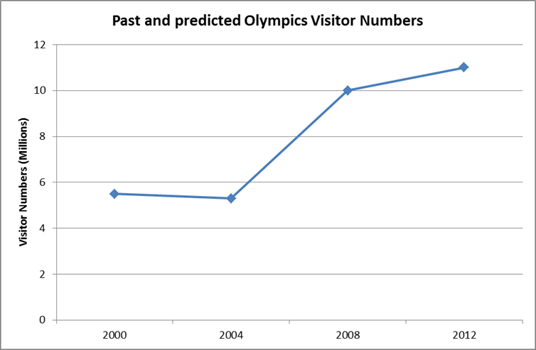 Rough visitor numbers, measured by ticket sales and numbers at official viewing areas can be found for the last 3 Olympics and are shown below, along with predictions for 2012.