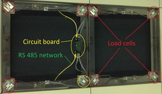 The image below shows the underlying framework when two tiles have been removed. You can see that just like the bathroom scales there are load cells which are pressed down by the tile. The tile presses directly onto the load cells so we have no need for the metal bars we saw above.