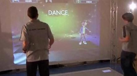 The dance game used with the smart floor on show at the museum is a prime example of this. The floor tracks where and how you are stood on the floor and uses this information to animate a virtual reality character that is displayed on the projection screen. The character moves around with you and leans from side to side as you move from one side to another.