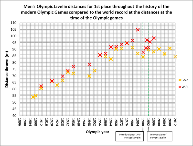 From the graph, you notice the distance records continue to increase, up until the world record in 1984. With the introduction of the re-designed javelin at the 1988 Olympics you then notice a significant drop in performance. After the redesign the records start to gradually increase again as manufacturers fight back and add design improvements to the javelin.