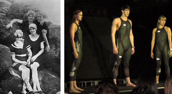 Figure 1 – Early woollen swim suits (left), Controversial Speedo LZR suit (right)