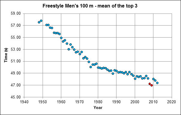Figure 3 -Mean of top 3 performances for Men’s 100 m freestyle swimming (Graph courtesy of Leon Foster)