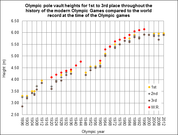 Figure 1 – Pole vault performances at the Olympics since 1896. Fibre glass poles first used at 1964 Olympic Games; world record jumps up by 48 cm! (Graph courtesy of Leon Foster)