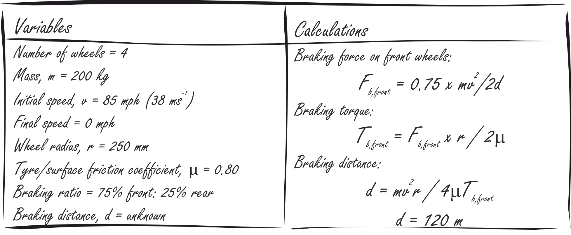 We were very lucky to work with Hope Technology on our brake selection. Hope’s brake expert, Guillaume Léon informed us that they are able to test their disc brakes up to a braking torque of 150 Nm. Although it was possible that the brakes would be able to withstand higher torque values it gave us a baseline to work from. Working with Guillaume we were able to estimate the braking distance required to come to a controlled stop from 85 mph.