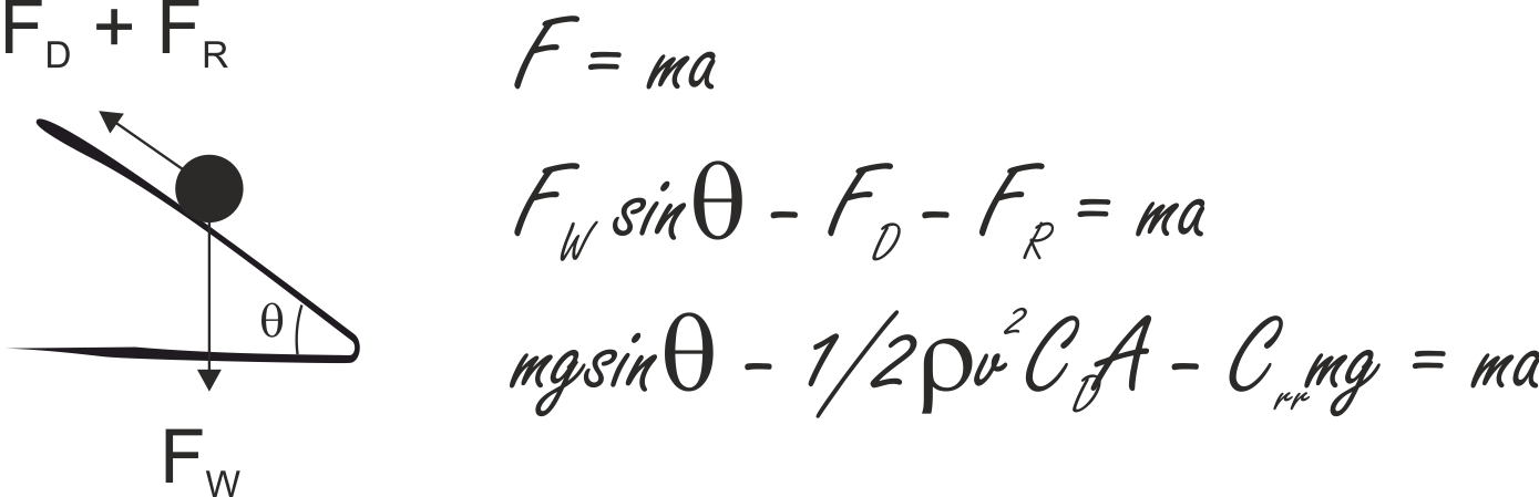 Similar to the sled project, we started with a simple Newtonian model: the forces acting against us were rolling resistance and aerodynamic drag, the only one in our favour was gravity. What could we do to reduce the retarding forces and could we find a venue to help us make the most of gravity?