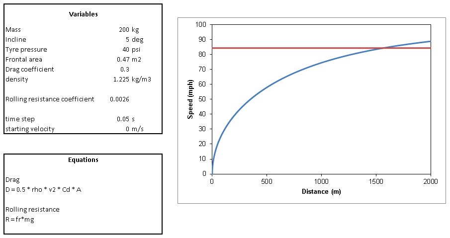 Initially the model was used to highlight the parameters we needed to optimise to maximise our chances of getting the world record. As the design and build of the gravity racer progressed we were able to update our model and use it to estimate whether or not certain run locations had sufficient incline and length to generate the speeds necessary to reach 85 mph.