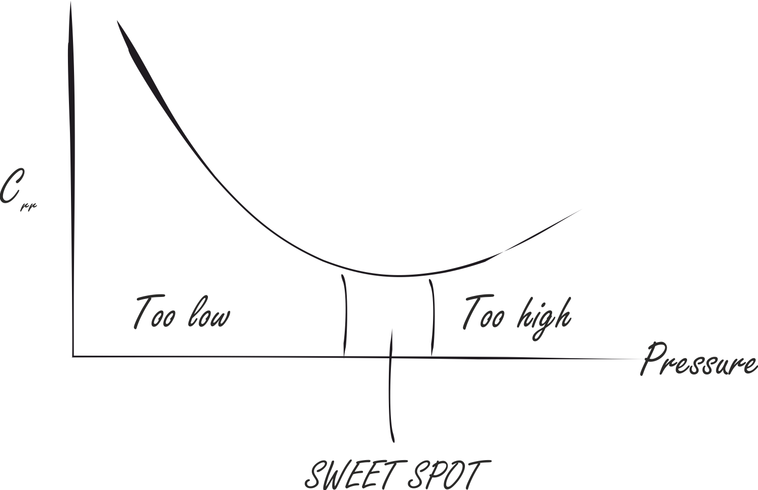 Pressure: It is often assumed that the higher the tyre pressure, the lower the rolling resistance. This is generally true − a tyre at higher pressure deforms less (resulting in a smaller contact patch between the tyre and the road) and less is energy lost to deformation. There are however, some circumstances where there can be too much pressure. Take for example, a typical UK road. During your commute to work you are likely to ride across numerous pot holes, manhole covers and loose gravel. During each encounter some of your forward momentum will be used to overcome the obstacle as the bikes trajectory is altered. However, if your tyre pressure is slightly lower, the tyre is able to deform around the obstacle, leaving the trajectory of the bike unaltered and preserving your forward momentum. It is more efficient to deform the tyre than it is to move the whole bike. And so, for every given wheel and road surface combination, there is a sweet spot of optimum pressure.