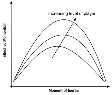 To aid the visualisation of this trade-off, I defined a parameter called effective momentum that combines swing speed with effective mass (recall that momentum is a product of speed and mass). What we begin to see from pilot experiment data is the shape of the curve that describes how effective momentum changes with MOI, and how its position will change depending on the level of skill of the player. It indicates the maximum useful MOI, where going any higher will be detrimental to performance.
