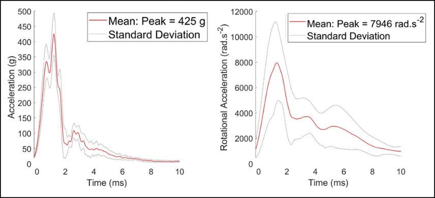 These findings are some early results in a much wider study looking at the conditions of severe head impact scenarios. We wanted to maintain a high level of biomechanical representation, though this required the sacrifice of repeatability. These acceleration time histories can be used to inform/validate future computer and mechanical recreations of head impact when falling from horseback. Ideally, this work will be extended to simulate a galloping horse and include other surfaces for equestrian activity, such as turf and sand.