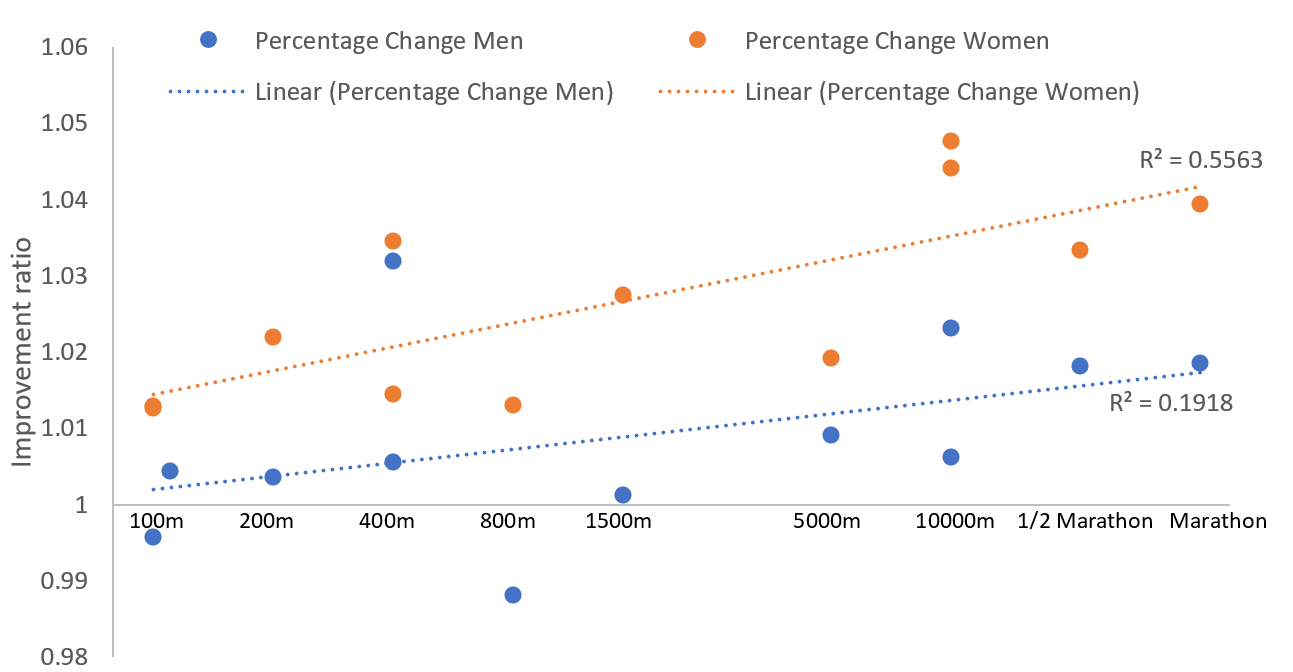 Figure 1. The ratio of the mean yearly best performance from 2021-23 to the mean yearly best performance from 2010-2015. Values greater than 1 show that performances in 2021-2023 were better than in 2010-2015. A logarithmic scale is used on the x-axis.